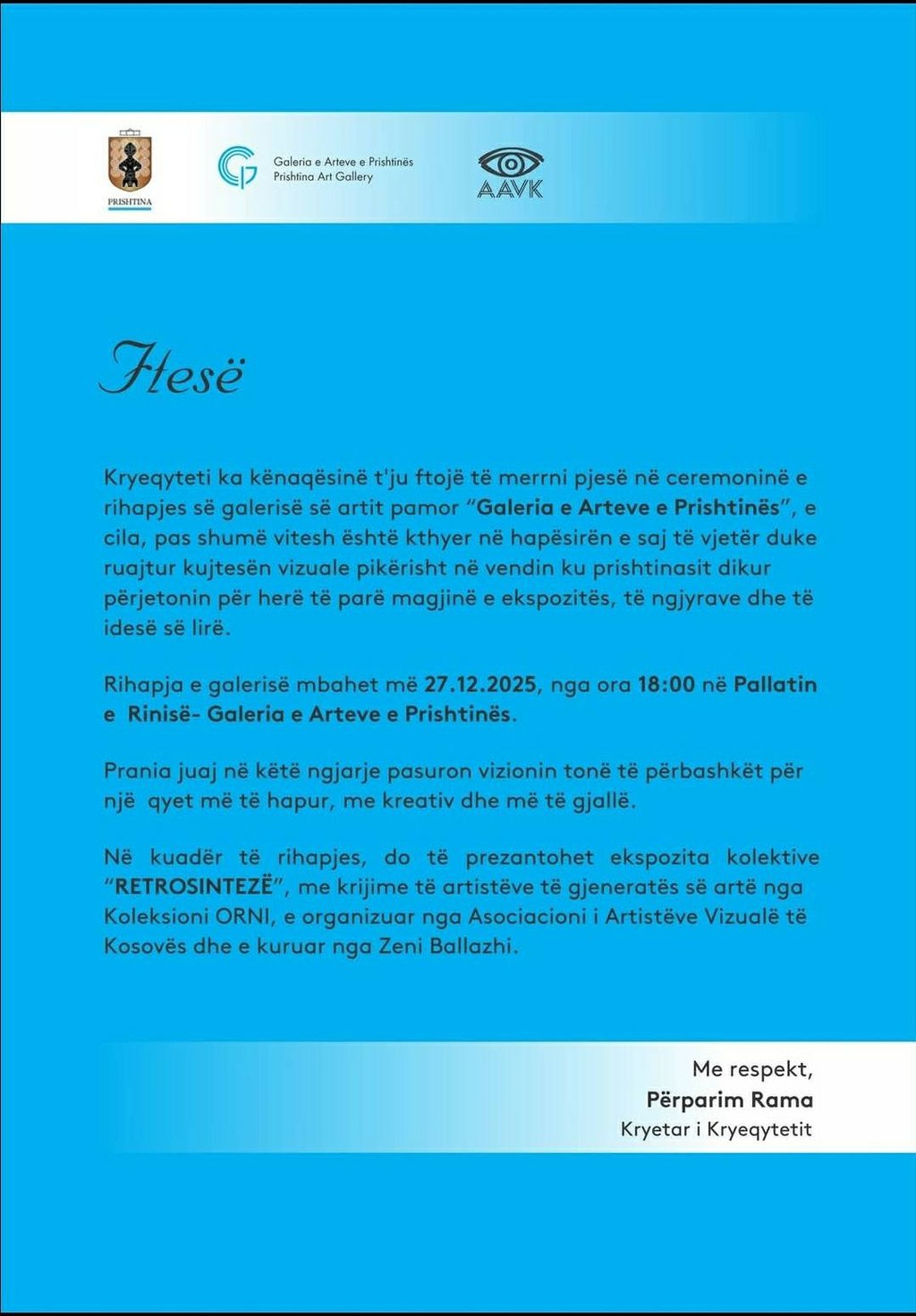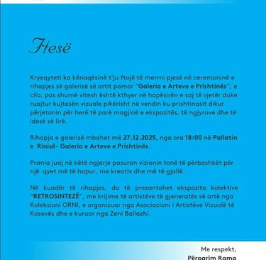 Njoftim dhe ftesë Me datë 27.12.2025 në ora 18:00 në Pallatin e Rinisë në Prishtinë, Kryeqyteti e rihapë “Galerinë e Arteve të Prishtinës”. Në kuadër të rihapjes, prezantohet ekspozita kolektive "RETROSINTEZË" me artist të gjeneratës së artë nga Koleksionin "ORNI", e organizuar nga Aosciacioni i Artistëve Vizual të Kosovës dhe e kuruar nga Zeni Ballazhi. Prandaj ju ftojmë të bëheni pjesë e kësaj ngjarje jashtëzakonisht të rëndësishme për artin dhe kulturën e vendit tonë. AAVK