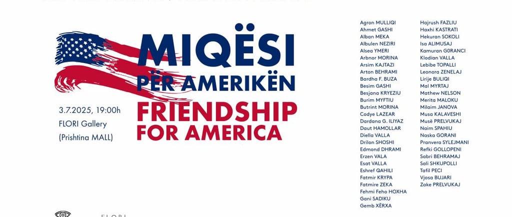 THE ASSOCIATION OF VISUAL ARTISTS OF KOSOVO in collaboration with FLORI Gallery, in honor of July 4th, Independence Day of the United States of America, organizes a collective exhibition with members of the AAVK, “FRIENDSHIP FOR AMERICA”. The exhibition will be held on 3.07.2025 at 19:00 at FLORI Gallery in Prishtina MALL.