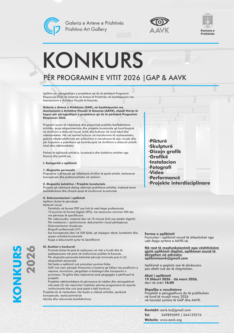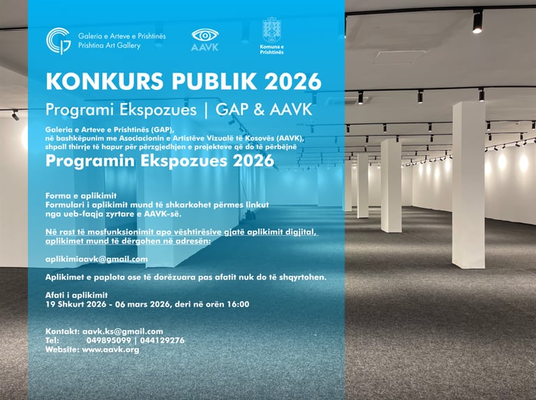 The Gallery of Arts of Prishtina (GAP), in cooperation with the Association of Visual Artists of Kosovo (AAVK), has officially announced the open call “Publik 2026 – Exhibition Program” for the selection of projects to be presented during the 2026 exhibition season.